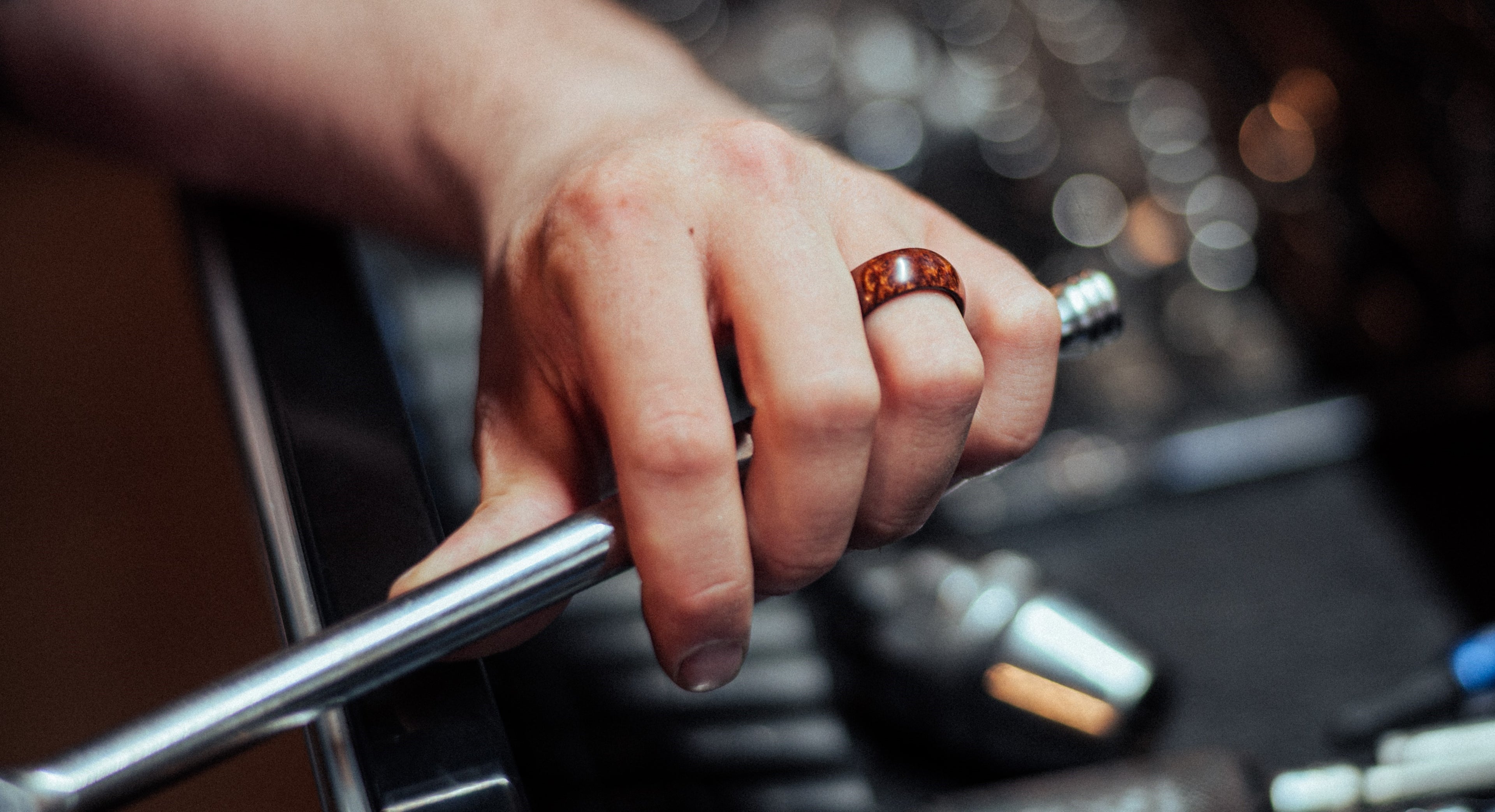 Desert Ironwood and Forged Carbon Fiber Mens Wedding Band