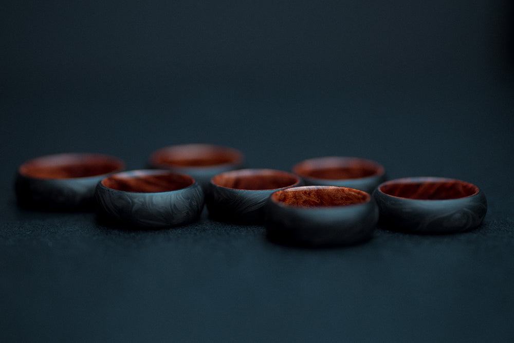 California Redwood Burl and Forged Carbon Fiber Mens Wedding Band
